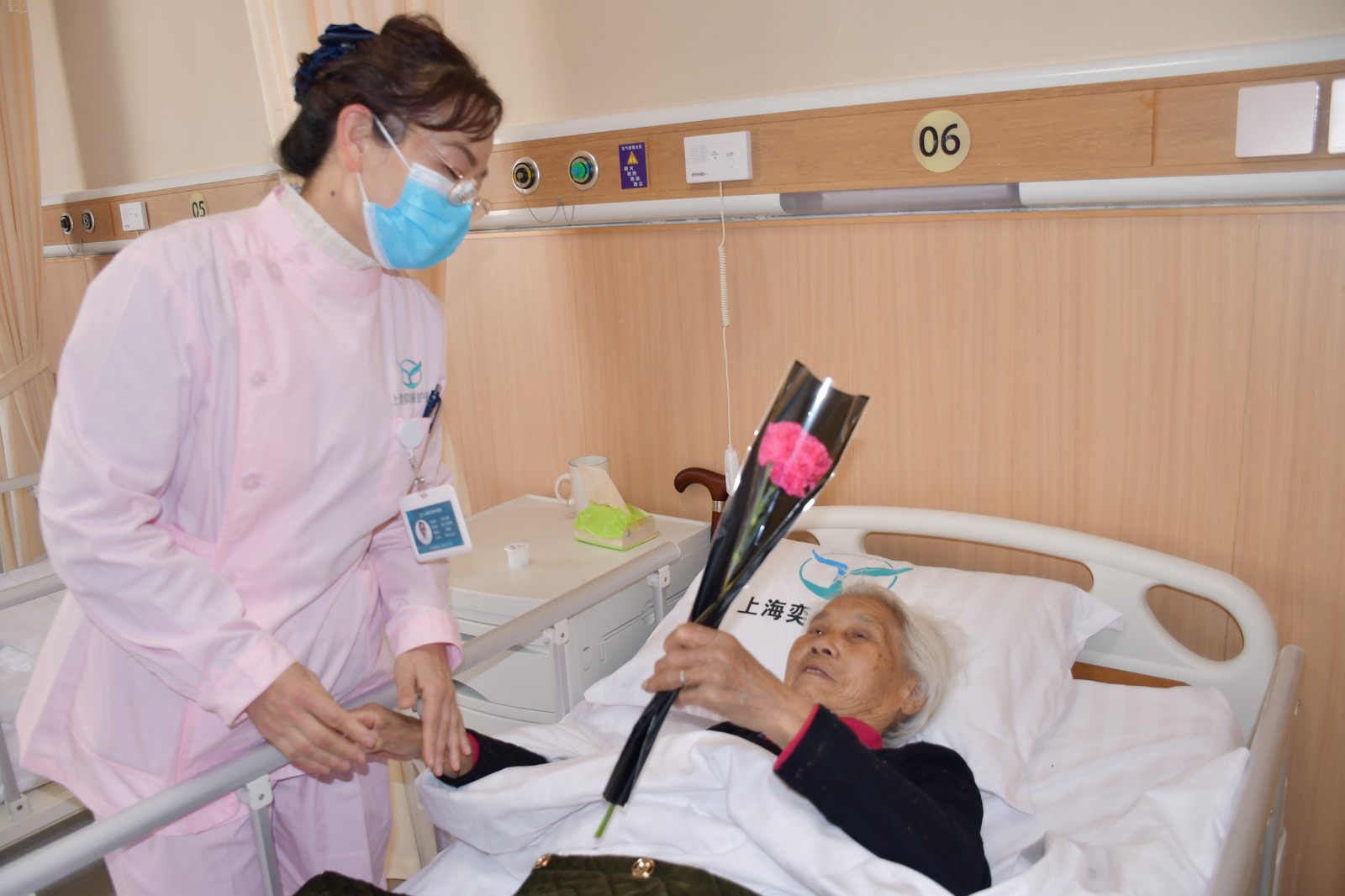 护士长和护工老师把美丽的花束送到不能到现场参与活动的奶奶床边,看着奶奶们幸福的笑脸,我们由衷感到无比的幸福。